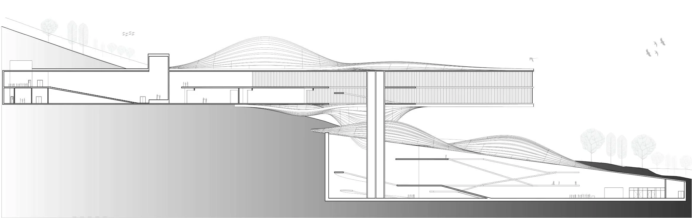 The architecture is divided into two interconnected parts, both above and below ground. The upper part extends from the highest point of the site, offering panoramic views, while the lower part modestly embeds itself in the land, embraced by the surrounding hills. This art gallery will serve as a new cultural and artistic hub for Rushan City, all while being an integral part of the local scenery, providing a unique cultural experience for visitors.
